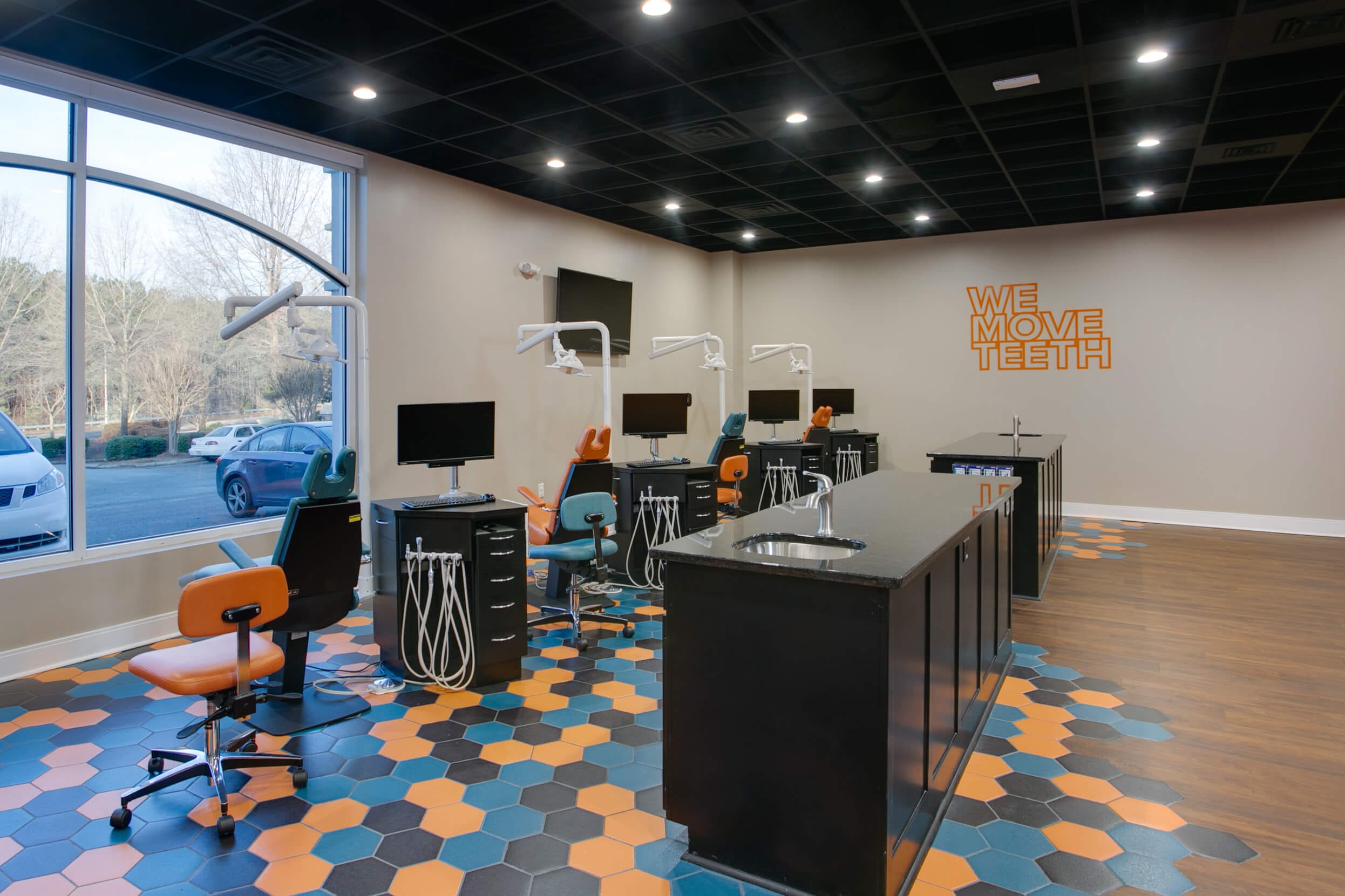 Services at our Cary Orthodontist office include Traditional Braces, Ceramic Braces, and Invisalign® Clear Aligners. Our Ortho Bay is also designed with fun in mind! Our bright orange and turquoise dental chairs and our ‘WE MOVE TEETH’ wall make for some fun social media photos – tag us @ncoralsurgeryandorthodontics!