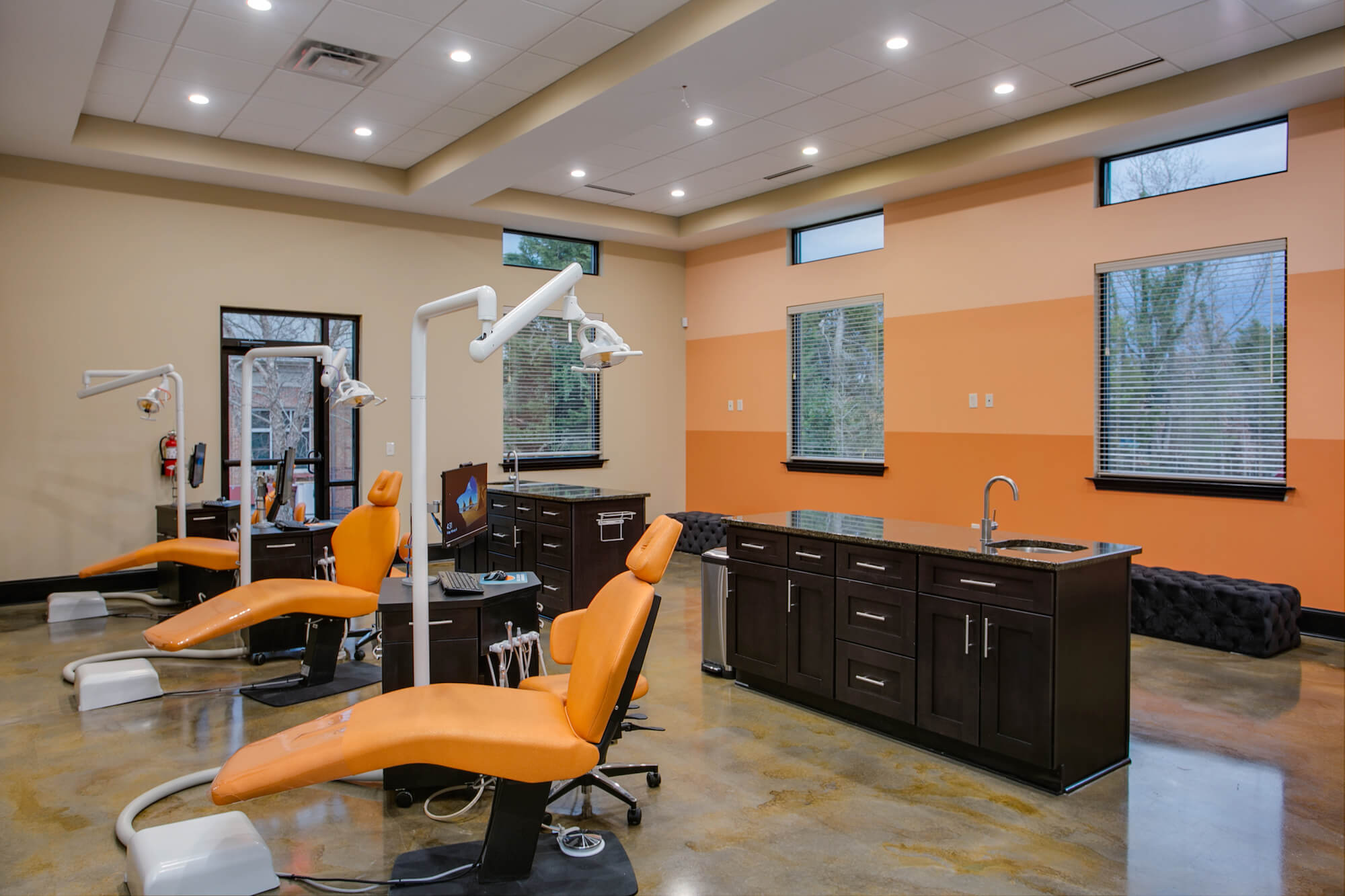 Services at our Winston-Salem Orthodontist office include Traditional Braces, Ceramic Braces, and Invisalign® Clear Aligners. Our Ortho Bay is also designed with fun in mind! Our bright orange dental chairs and our striped orange wall make for some fun social media photos – tag us @ncoralsurgeryandorthodontics!